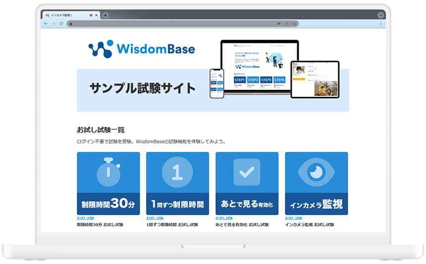 受験画面や不正対策機能などWisdomBaseの試験機能を体験いただけます。