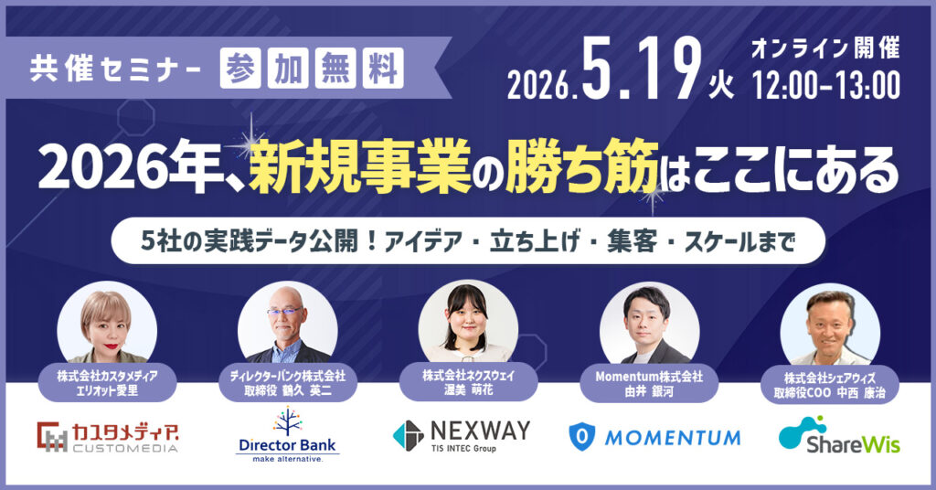 5月19日(火)13時よりウェビナー「【5社の実践データを公開】2026年、新規事業の勝ち筋はここにある」を開催します。